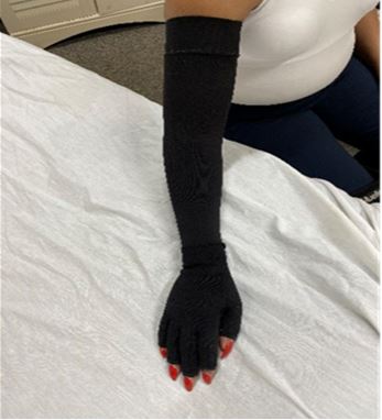Bên trái: Băng ép và găng tay để kiểm soát phù bạch huyết.